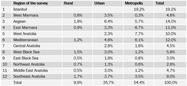 Örneklem, ADNKS (Adrese Dayalı Nüfus Kayıt Sistemi) verilerine dayalı mahalle ve köylerin nüfus büyüklükleri ve eğitim seviyeleri verileri ile 24 Haziran 2018 Genel seçimlerinin mahalle ve köy sonuçları katmanlandırılarak hazırlanmıştır. Yerleşim yerleri önce kır/kent/metropol olarak ayrıştırılmış ve 12 bölge esas alınarak örneklem tespit edilmiştir.