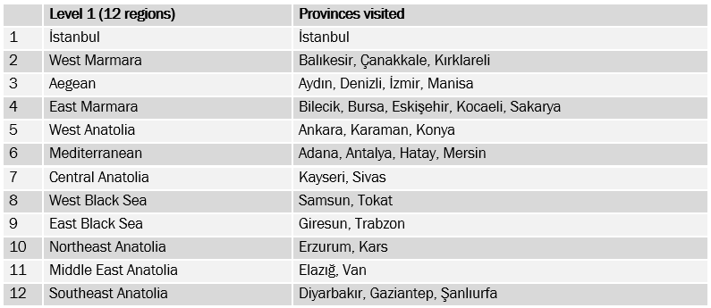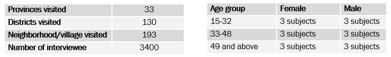 Araştırma kapsamında, 33 ilin merkez dahil 130 ilçesine bağlı 193 mahalle ve köyünde 3400 kişiyle hanelerinde yüz yüze görüşülmüştür. Her bir mahallede gerçekleştirilen 18 anket için yaş ve cinsiyet kotası uygulanmıştır.