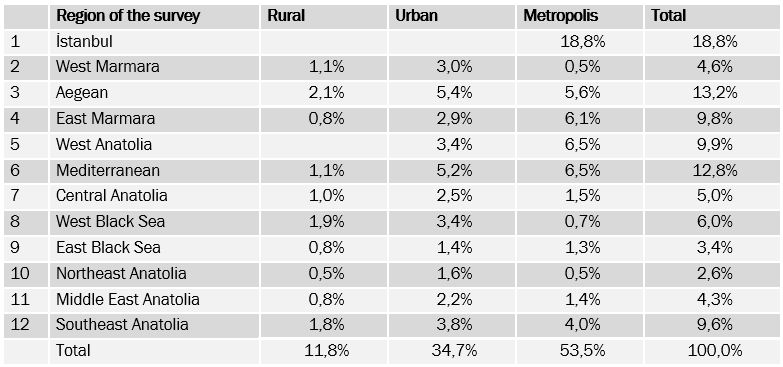 Örneklem, ADNKS (Adrese Dayalı Nüfus Kayıt Sistemi) verilerine dayalı mahalle ve köylerin nüfus büyüklükleri ve eğitim seviyeleri verileri ile 24 Haziran 2018 Genel seçimlerinin mahalle ve köy sonuçları katmanlandırılarak hazırlanmıştır. Yerleşim yerleri önce kır/kent/metropol olarak ayrıştırılmış ve 12 bölge esas alınarak örneklem tespit edilmiştir.