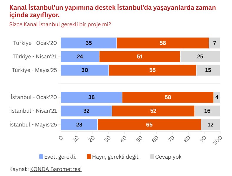 KONDA Mayıs'25 Barometresi araştırmasının Güncel Siyaset bölümü, tutuklu İBB Başkanı ve CHP'nin Cumhurbaşkanı Adayı Ekrem İmamoğlu hakkındaki yolsuzluk iddialarına yönelik toplumsal algı ve tutumlar ile Kanal İstanbul Projesi'nin yapımını dair toplumsal tutumların analiz ve değerlendirmesini içeriyor: