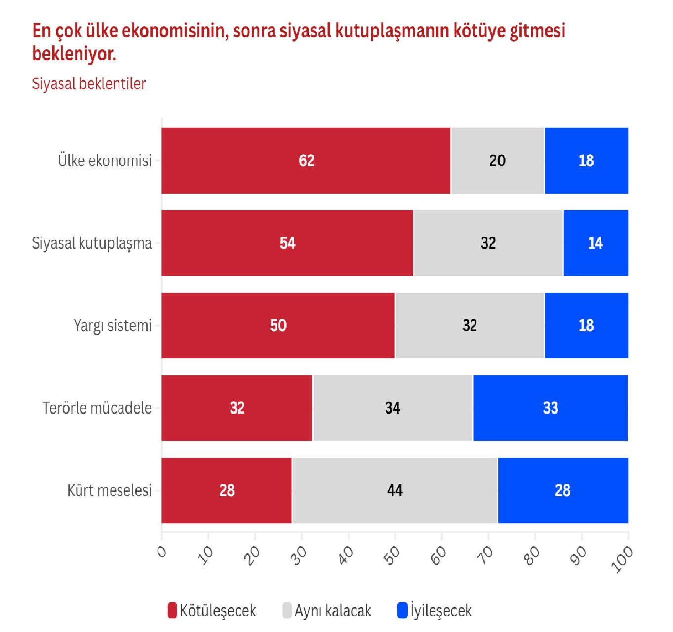 Ekonomiye dair iyimser beklentiler son yıllardaki en düşük seviyesinde. Hükümetin politikalarının ülke ekonomisine olumlu etkisi olmayacağı görüşü iktidar bloku seçmenlerini de etkisi altına almış durumda, toplum genelinde bu politikaların ekonomiyi olumsuz etkileyeceğini düşünenlerin oranı yüzde 65. Yargı sistemi, siyasal kutuplaşma gibi konularda da toplum geneline hakim olan bir kötümser beklenti var, yargı sisteminin kötüleşeceğini düşünenler yüzde 50 iken siyasal kutuplaşmanın kötüleşeceğini bekleyenler yüzde 54. Kürt meselesi ve terörle mücadele ise bir kırılım yaratıyor. MHP seçmenlerinde Kürt meselesine yönelik negatif beklenti, DEM seçmenlerinde ise pozitif beklenti artmış durumda. Toplum genelinde ise iyimser beklenti oranı yüzde 28.