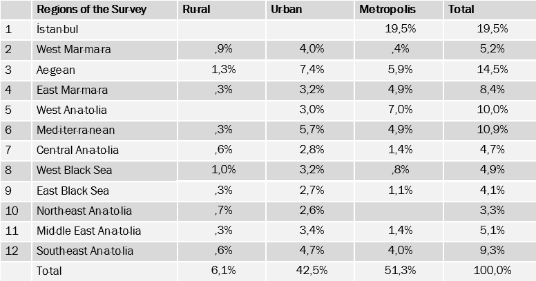 Örneklem, ADNKS (Adrese Dayalı Nüfus Kayıt Sistemi) verilerine dayalı mahalle ve köylerin nüfus büyüklükleri ve eğitim seviyeleri verileri ile 24 Haziran 2018 Genel seçimlerinin mahalle ve köy sonuçları katmanlandırılarak hazırlanmıştır. Yerleşim yerleri önce kır/kent/metropol olarak ayrıştırılmış ve 12 bölge esas alınarak örneklem tespit edilmiştir.