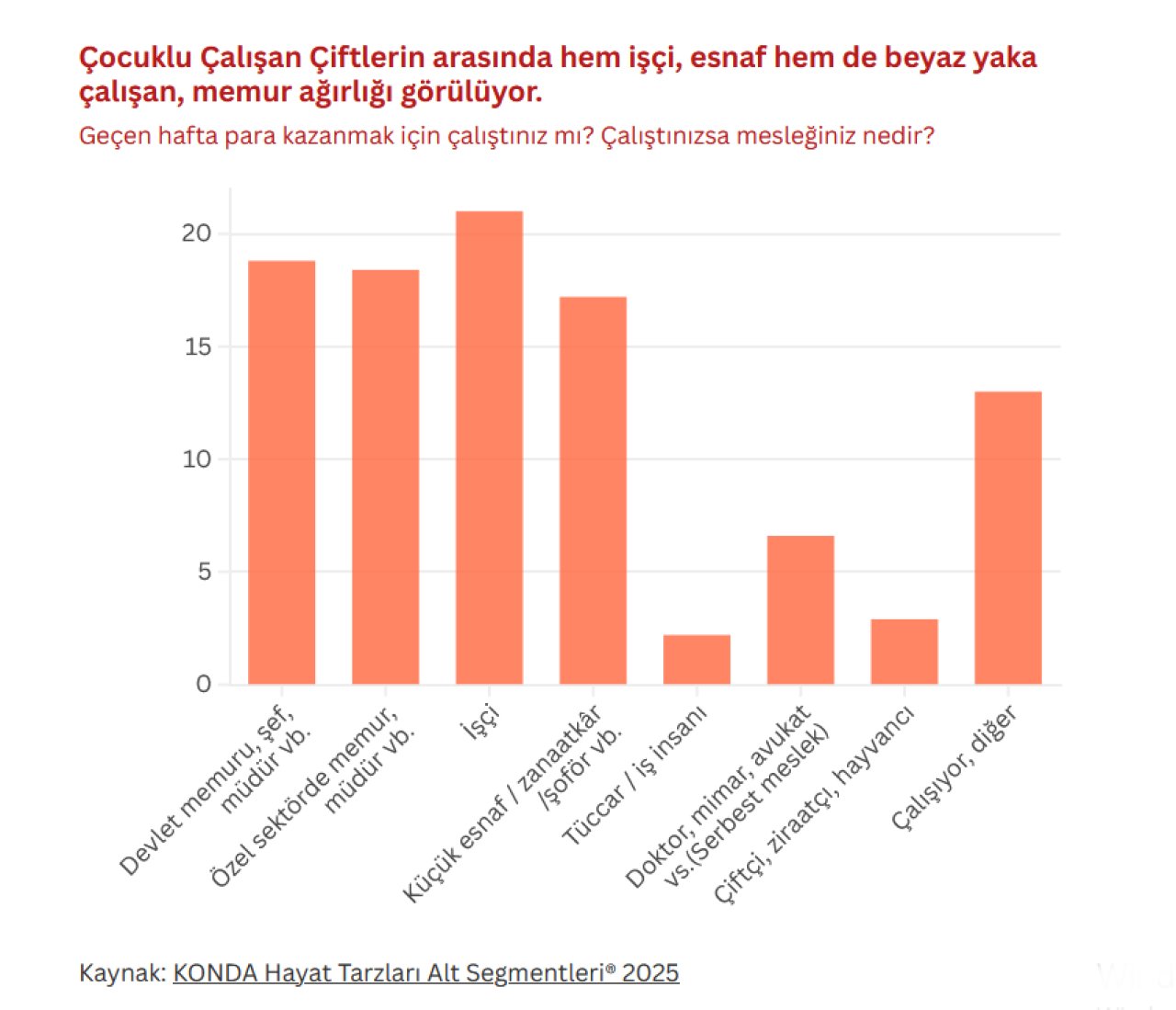 KONDA Hayat Tarzları Alt Segmentleri® 2025 bulgularına göre Türkiye’nin yüzde 9’unu oluşturan Çç.20- Çocuklu Çalışan Çiftlerin hanelerinde yaşayan 17 yaş altında çocukları var, evliler ve çiftlerin ikisi de çalışıyor. 2015’ten günümüze bu segmentin düzenli olarak genişlemekte olduğunu görüyoruz.