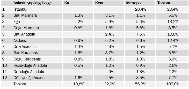 Araştırma kapsamında, 32 ilin merkez dahil 101 ilçesine bağlı 146 mahalle ve köyünde 2833 kişiyle hanelerinde yüz yüze görüşülmüştür. Her bir mahallede gerçekleştirilen 18 anket için yaş ve cinsiyet kotası uygulanmıştır.