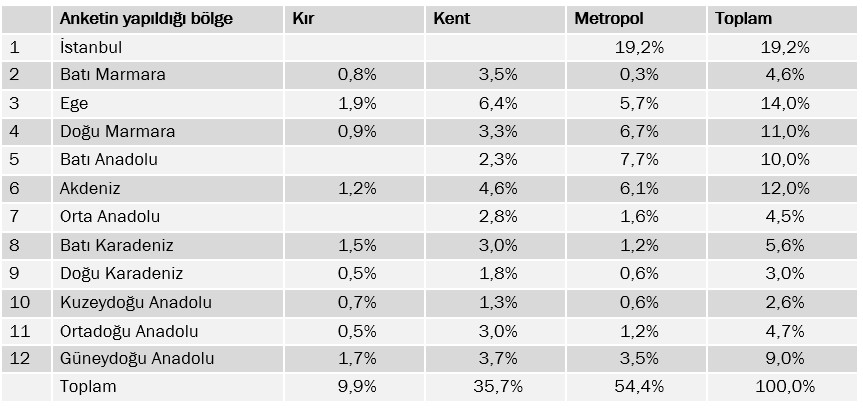The sample was prepared by stratification of the data on population and educational level of neighborhoods and villages based on Address-Based Population Registration System with the neighborhood and village results of the 24 June 2018 General Elections. Residential areas were first graded as rural/urban/metropolitan and then the sample was identified based on 12 regions