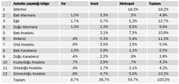 Araştırma kapsamında, 32 ilin merkez dahil 122 ilçesine bağlı 190 mahalle ve köyünde 3568 kişiyle hanelerinde yüz yüze görüşülmüştür. Her bir mahallede gerçekleştirilen 18 anket için yaş ve cinsiyet kotası uygulanmıştır.