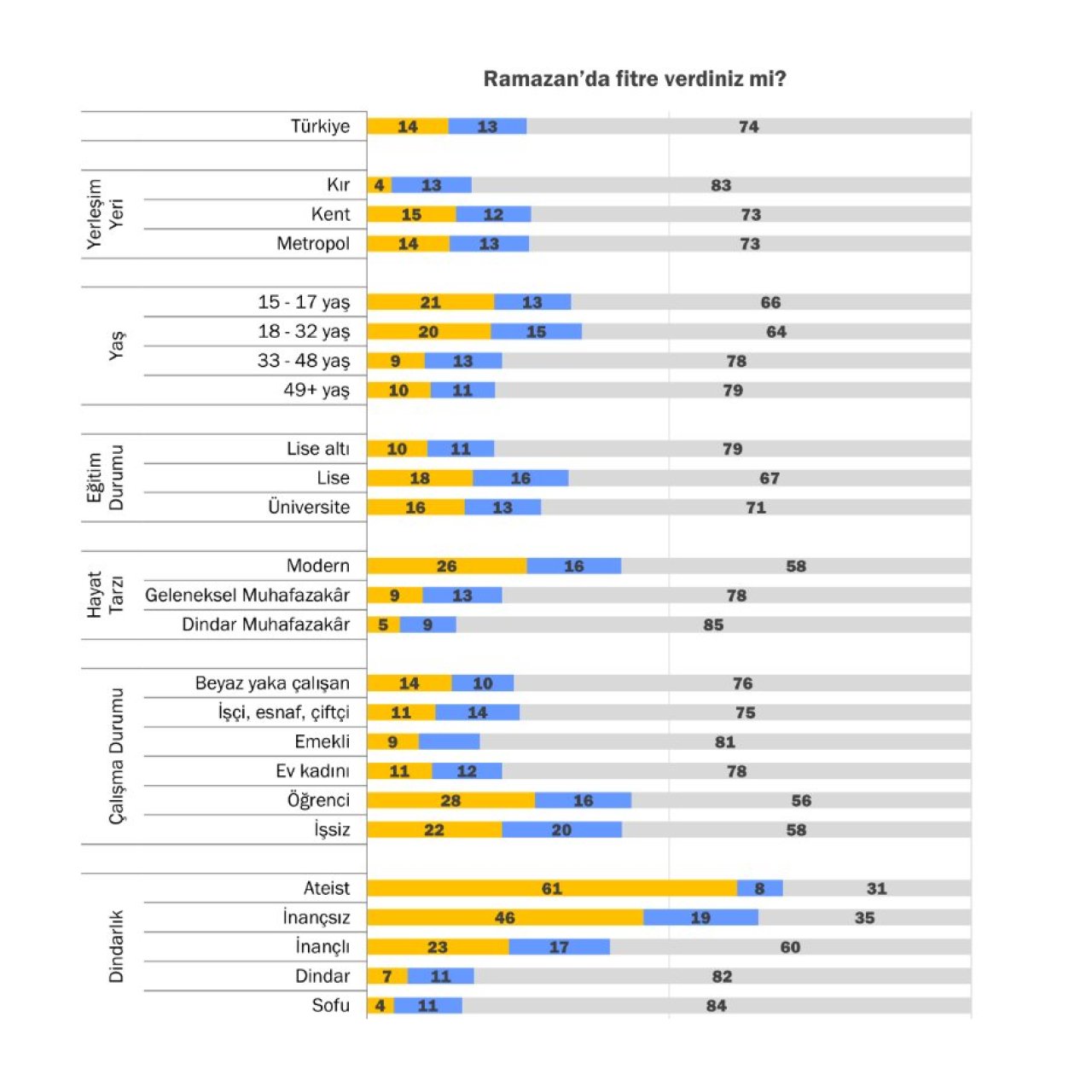 Bölümde, bireylerin Ramazan ayında oruç tutma pratikleri ve fitre verme davranışları üzerinden dini ritüellere katılım düzeyleri inceleniyor: