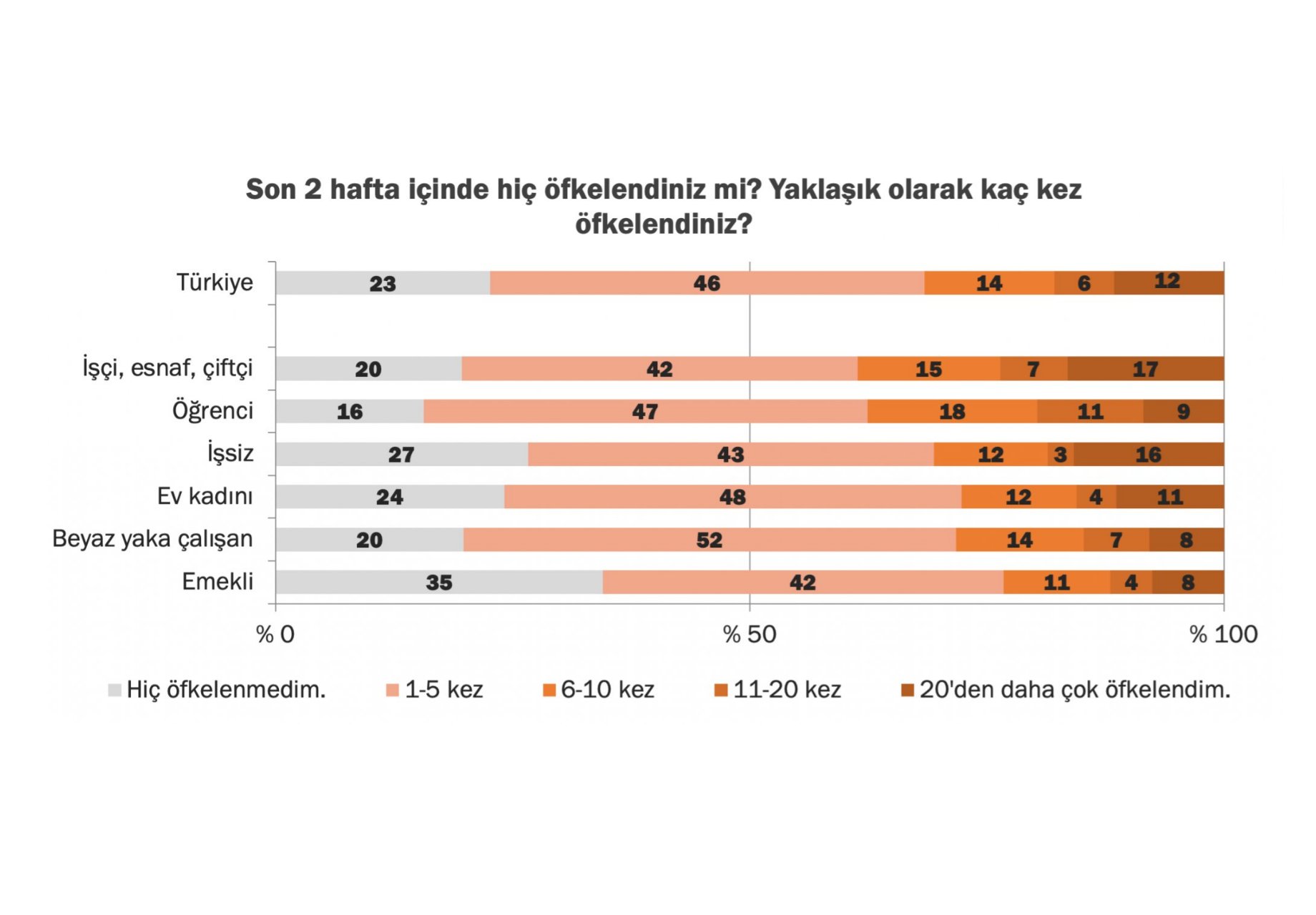 Türkiye’de yaşayan insanlar en çok aile içi durumlardan, sonrasında ise maddi sorunlardan dolayı öfkeleniyor. Bunları iş yerindeki durumlar ve diğer nedenler takip ediyor. Kadınlar daha çok aile içi durumlara, erkekler ise maddi sorunlara ve iş yerindeki durumlara öfkeleniyor. Aynı zamanda erkekler, kadınlardan sık öfkeleniyor. Gelir seviyesi arttıkça iş yerindeki durumlara, düştükçe aile içi durumlara öfkelenenlerin oranı artıyor. Yaşın artması ise öfkelenme sıklığını azaltıyor. Çalışma durumlarına göre ayrılan gruplar arasında en çok öğrenciler, en az emekliler öfkeleniyor. Öte yandan, siyasi koşullara en çok emekliler öfkeleniyor. Geçinebilme durumu ile öfkelenme sıklığı arasında da pozitif ilişki var. Toplumun öfkesini en çok tetikleyen durum ise adaletsizlik, bunu maddi sorunlar ve aile içi durumlar takip ediyor. Öfkelendiğinde verdiği 2 tepki sorulanlar arasında ağladığını belirtenler yüksek oranda kadınken fiziksel tepki verdiğini belirtenler yüksek oranda erkek.