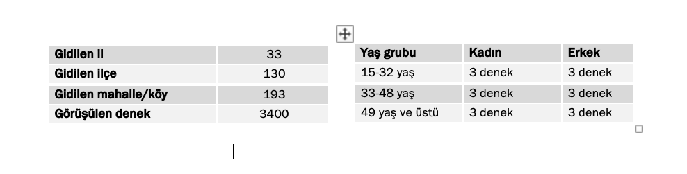 Araştırma kapsamında, 33 ilin merkez dahil 130 ilçesine bağlı 193 mahalle ve köyünde 3400 kişiyle hanelerinde yüz yüze görüşülmüştür. Her bir mahallede gerçekleştirilen 18 anket için yaş ve cinsiyet kotası uygulanmıştır.