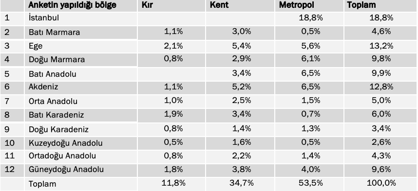 Örneklem, ADNKS (Adrese Dayalı Nüfus Kayıt Sistemi) verilerine dayalı mahalle ve köylerin nüfus büyüklükleri ve eğitim seviyeleri verileri ile 24 Haziran 2018 Genel seçimlerinin mahalle ve köy sonuçları katmanlandırılarak hazırlanmıştır. Yerleşim yerleri önce kır/kent/metropol olarak ayrıştırılmış ve 12 bölge esas alınarak örneklem tespit edilmiştir.