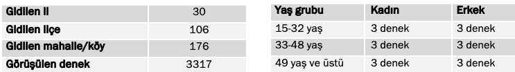 Araştırma kapsamında, 30 ilin merkez dahil 106 ilçesine bağlı 176 mahalle ve köyünde 3317 kişiyle hanelerinde yüz yüze görüşülmüştür. Her bir mahallede gerçekleştirilen 18 anket için yaş ve cinsiyet kotası uygulanmıştır.