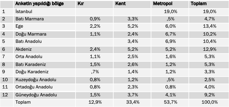 Örneklem, ADNKS (Adrese Dayalı Nüfus Kayıt Sistemi) verilerine dayalı mahalle ve köylerin nüfus büyüklükleri ve eğitim seviyeleri verileri ile 24 Haziran 2018 Genel seçimlerinin mahalle ve köy sonuçları katmanlandırılarak hazırlanmıştır. Yerleşim yerleri önce kır/kent/metropol olarak ayrıştırılmış ve 12 bölge esas alınarak örneklem tespit edilmiştir.