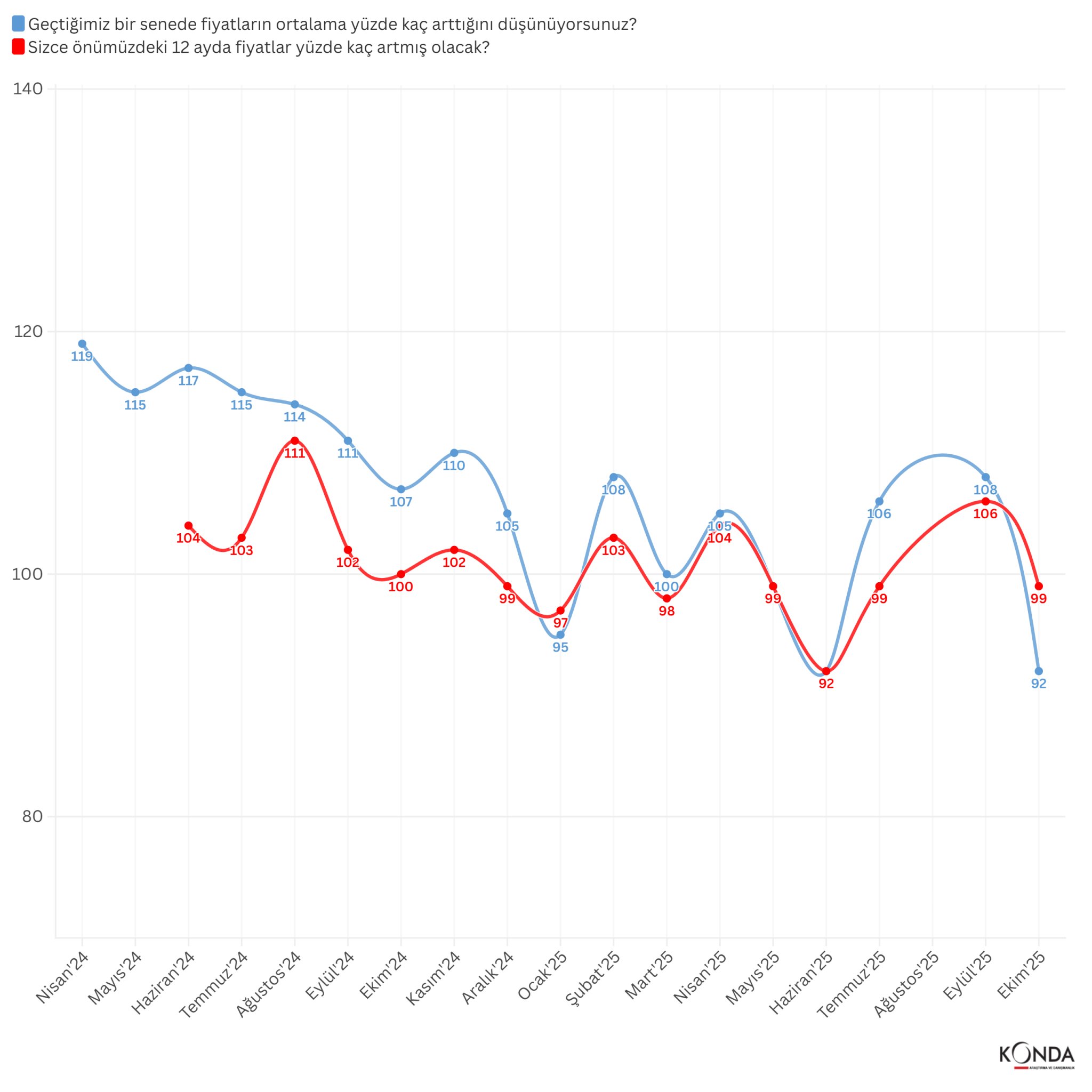 Toplumun geriye dönük 12 aylık enflasyon algısı, Eylül ayında ortalama yüzde 108 seviyesindeyken, Ekim ayına geldiğimizde yüzde 92’ye gerilemiştir. Benzer şekilde, 12 ay sonrasına yönelik enflasyon beklentisi Eylül ayında yüzde 106 seviyesindeyken, Ekim ayına geldiğimizde 7 puanlık bir düşüşle yüzde 99'a gerilemiştir.