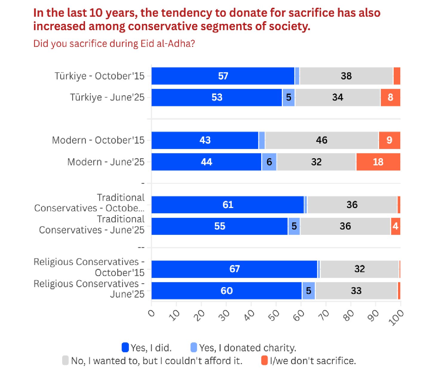 This section includes an analysis of who sacrificed animals during Eid al-Adha in 2025, who donated instead, and the changing trends in sacrifice practices over the years: