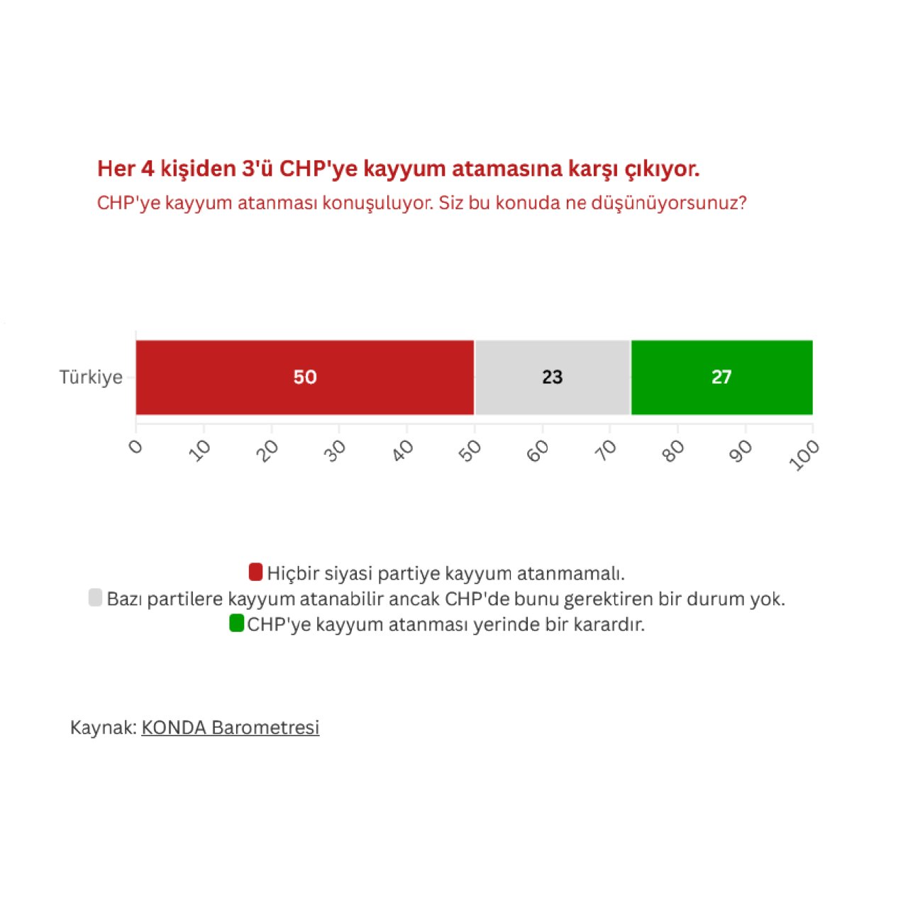 CHP'ye kayyum atamasına onay toplum genelinde oldukça düşük. Kayyumu destekleyenler en çok Ak Parti seçmenleri arasında yer alıyor. MHP seçmenleri arasında kayyuma karşı çıkanların oranı destekleyenlerin oranından yüksek. Genel olarak toplum geneli iktidar ve muhalefet arasındaki gerilimde iki taraftan da yana tavır almama eğiliminde. Her 5 kişiden 3'ü iktidarın da muhalefetin de kendi derdinde olduğunu düşünüyor. CHP'ye kayyum atamasını doğru bulanların oranıysa yüzde 27.