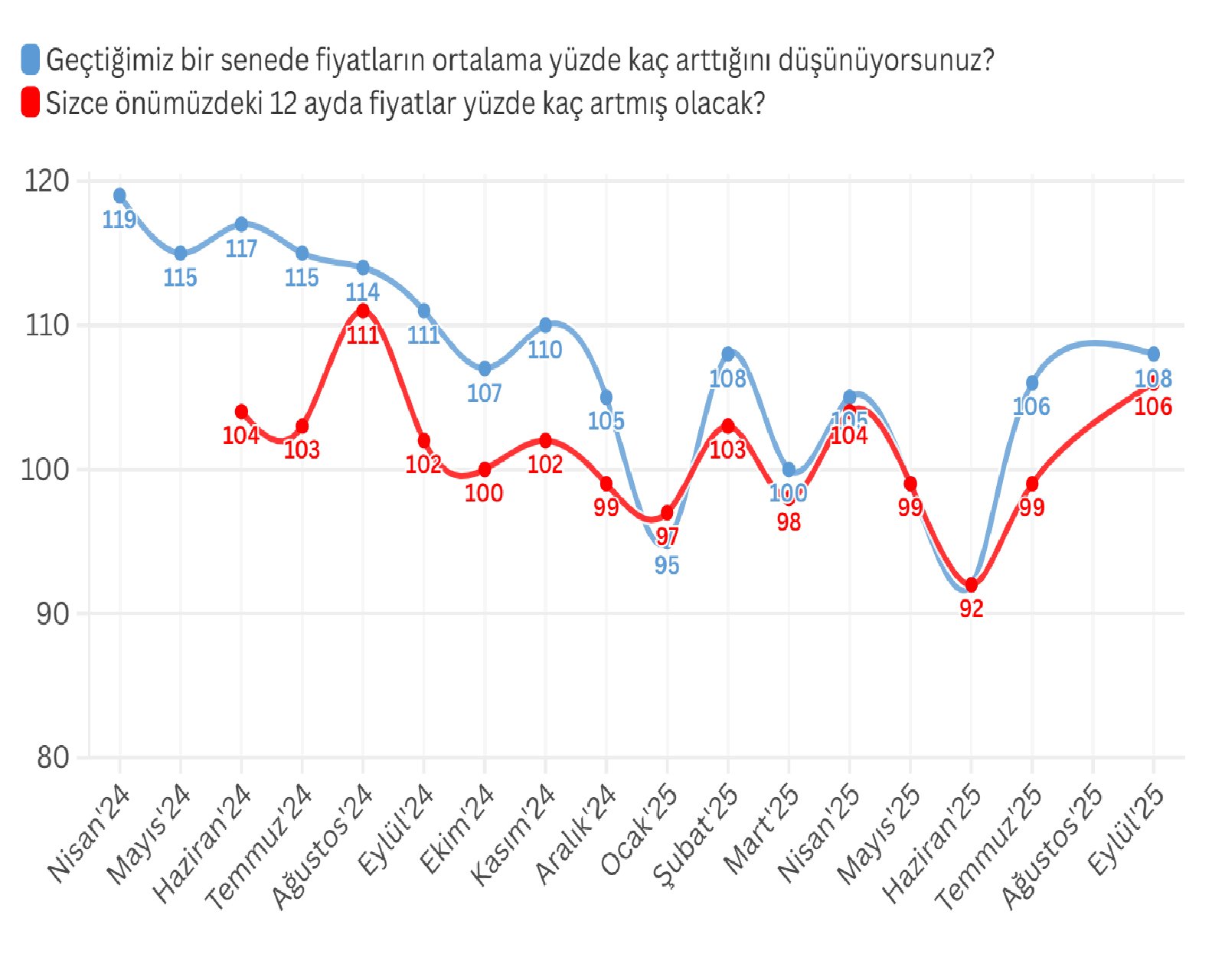 Toplumun geriye dönük 12 aylık enflasyon algısı, Temmuz ayında ortalama yüzde 106 seviyesindeyken, Eylül ayına geldiğimizde yüzde 108’e yükselmiştir. Benzer şekilde, 12 ay sonrasına yönelik enflasyon beklentisi Temmuz ayında yüzde 99 seviyesindeyken, Eylül ayına geldiğimizde 7 puanlık bir artışla yüzde 106'ya yükselmiştir.