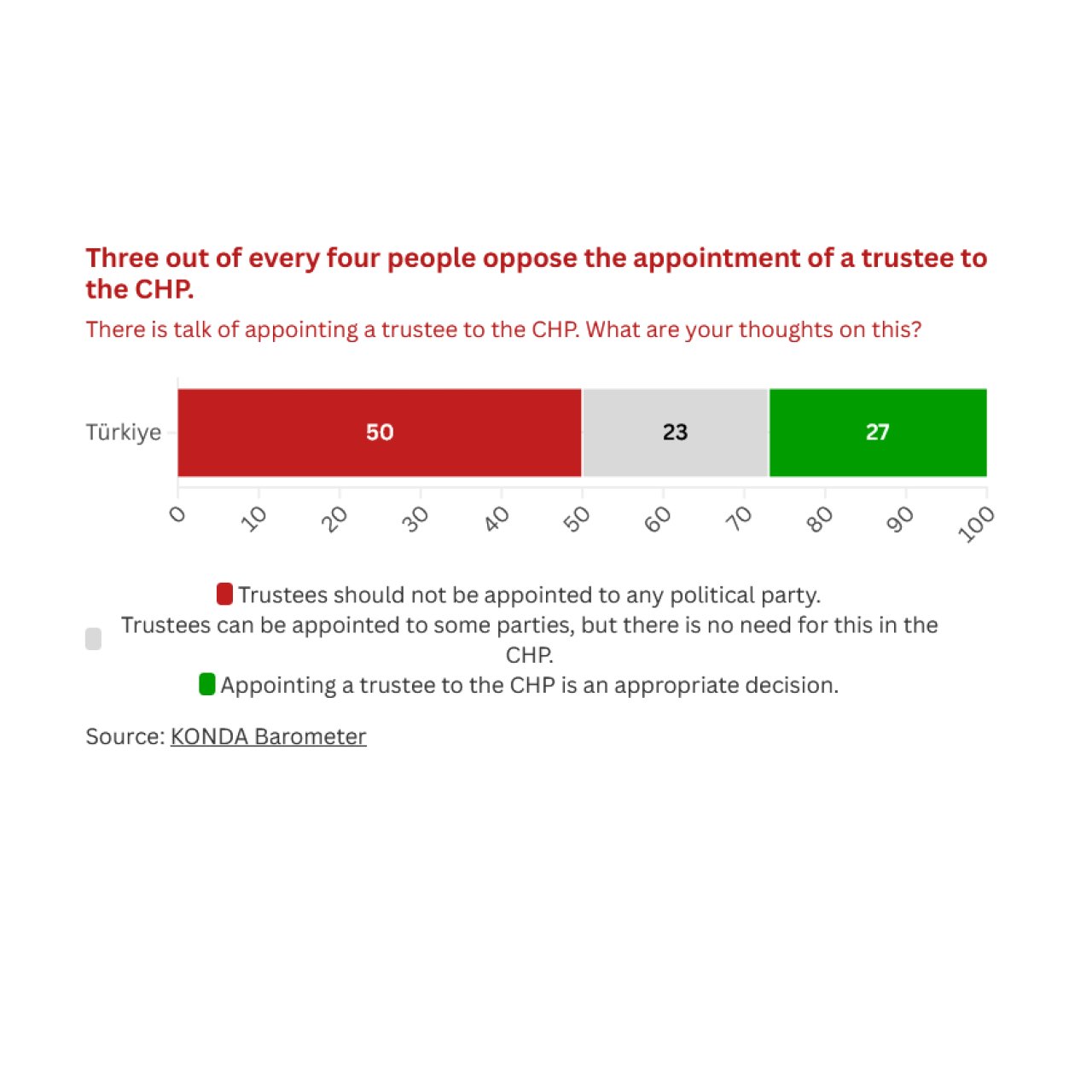Approval for the appointment of a trustee to the CHP is quite low across society. Support for trustees is highest among Ak Parti voters. Among MHP voters, the percentage of those opposing trustees is higher than the percentage of those supporting them. Generally, society tends to side with neither side in the tension between the government and the opposition. Three in five people believe both the government and the opposition have their own concerns. The percentage of those who approve of the appointment of a trustee to the CHP is 27 percent.