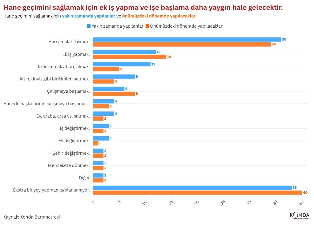 Ekonomik darboğaz, hanelerin geçim stratejilerine yansıyor. Harcamaları kısmak temel öncelik olurken, önümüzdeki dönemde çalışma ve ek iş yapma planları artıyor. Buna karşın, ekstra bir adım atmayanların oranı da yükseliyor. Bu durum bazı hanelerin uygulanabilir stratejilerini büyük ölçüde tüketmiş olabileceğine işaret ediyor. Genel olarak, haneler yakın dönemde başvurdukları stratejileri sürdürme eğiliminde.
