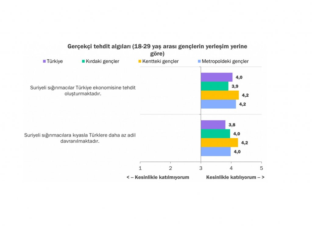 Bölümde, Türkiye'de yaşayan Suriyelilere yönelik gerçekçi ve sembolik tehdit algıları ve kolektif eyleme geçme potansiyeli katılımcıların farklı özelliklerine göre irdeleniyor. Sabancı Üniversitesi'nden Doç. Dr. Sabahat Çiğdem Bağcı ve Duygu Yurt konunun kavramsal arka planını sunuyor:Gerçekçi tehdit algıları (Suriyeli sığınmacılar Türkiye ekonomisine tehdit oluşturmaktadır. / Suriy