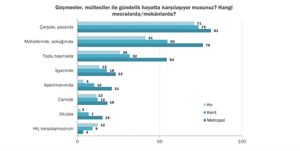 Bölümde, bireylerin göçmenler ve Suriyeli sığınmacılarla gündelik hayattaki karşılaşma sıklığı ve deneyimleri, bu konudaki çözüm beklentileri ile Gezi Parkı olaylarına yönelik tutumları ele alınıyor:Sokağa çıktığınızda göçmenler, mültecilerle ne sıklıkla karşılaşıyorsunuz?Sokağa çıktığınızda Suriyeli sığınmacılarla ne sıklıkta karşılaşıyorsunuz?Göçmenler, mü