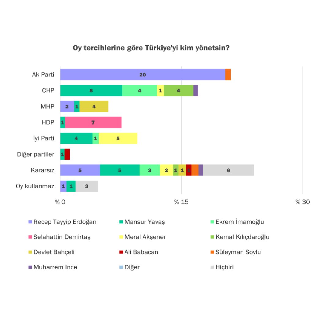 Bölümde, seçmenlerin güncel oy tercihleri, Erdoğan’ın seçilmesi durumuna dair beklentileri, ekonomik krizden çıkış konusunda Erdoğan’a duyulan güven ve oy vermekten vazgeçilmeyecek partilere yönelik sadakat düzeyleri inceleniyor:Bugün seçim olsa oyunuzu hangi partiye verirsiniz? (doğrudan tercih ve kararsızlar dağıtılmış) Önümüzdeki Cumhurbaşkanlığı seçimini Recep Tayy
